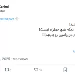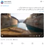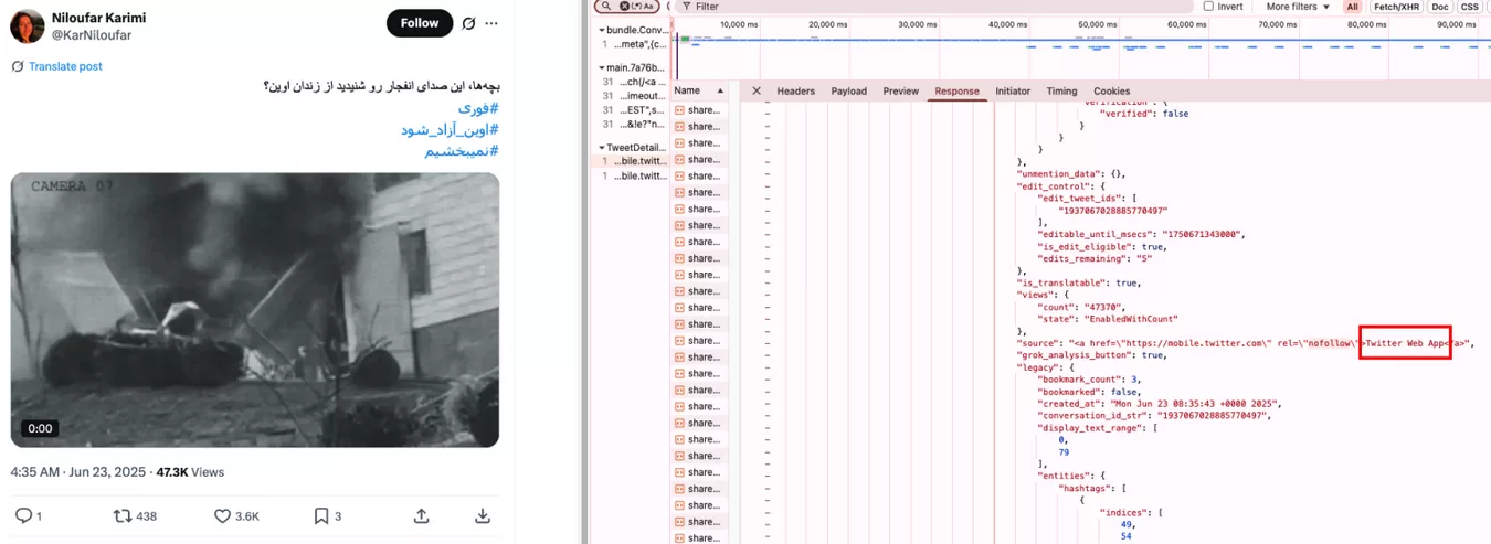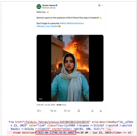 - این حساب، یک ویدیوی تولید شده با هوش مصنوعی منتشر کرد که ظاهراً نشان دهنده سوختن زندان اوین بعد از حملات نیروهای دفاعی اسرائیل (IDF) بود. این پست تنها چهار دقیقه بعد از انتشار ویدیوی هوش مصنوعی توسط حساب KarNiloufar منتشر شد، در حالیکه بر اساس محاسبات عمومی که قبلا در این گزارش توضیح داده شد، حملات هنوز در حال انجام بودن.