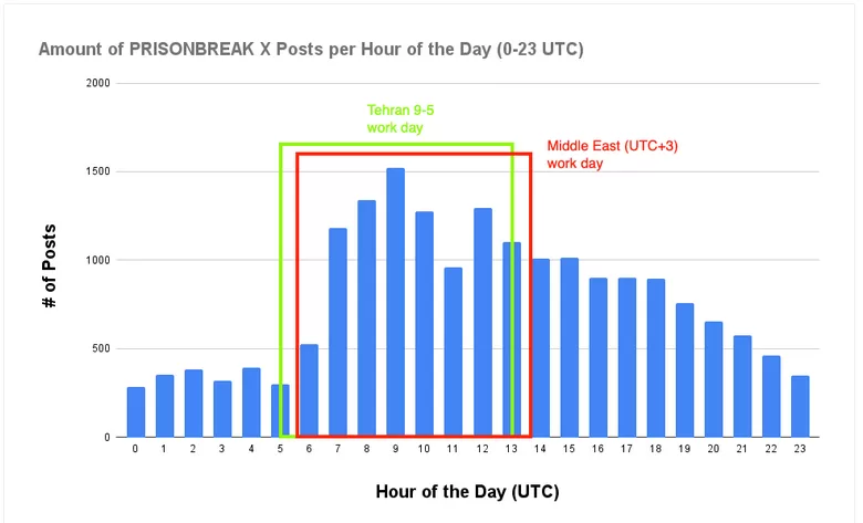 این رفتار تقریباً با یک روز کاری منظم در منطقه زمانی ایران (زمان استاندارد ایران یا IRST، معادل UTC+3:30) و حتی بیشتر با UTC+3، منطقه زمانی که در اکثر نقاط خاورمیانه (و همچنین اروپای شرقی و بخشهایی از شرق آفریقا)، از جمله اسرائیل، اعمال میشه، همخوانی داره. با این حال، این رفتار با یک جامعه واقعی از کاربران که بصورت خودجوش در زمانهای تصادفی پست میکنن، ناسازگاره.