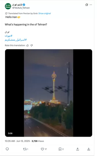 - همچنین این اکانت تصاویر و ویدیوهایی رو منتشر کرد که کمتر بصورت واضح توسط هوش مصنوعی تولید شده بودن و بیشتر به نظر میرسید روش عملیاتی PRISONBREAK رو دنبال میکردن. مثلا، ویدیویی از یک حمله هوایی ادعایی به تهران توسط نیروهای نظامی ناشناس در ۱۳ ژوئن ۲۰۲۵، روزی که IDF برای اولین بار جاهایی از ایران رو هدف قرار داد و جنگ 12 روزه رو شروع کرد.
