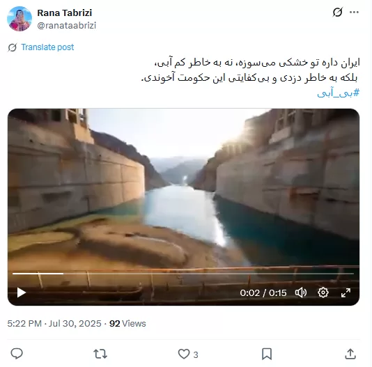 در زمان نگارش این گزارش، PRISONBREAK همچنان بطور مداوم درباره بحران آب و کمبود انرژی پست میذاره، احتمالاً در تلاش برای ادامه تشدید تنش ها بین شهروندان ایرانی و دولت. دو نمونه از این محتوا که توسط شبکه منتشر شده رو در زیر مشاهده میکنید.