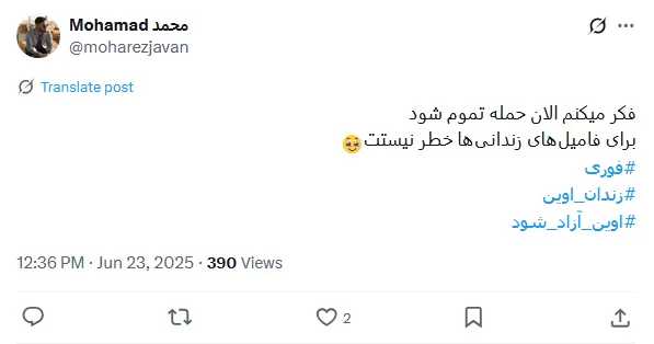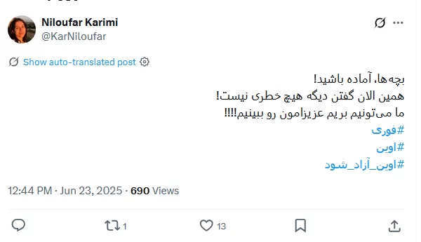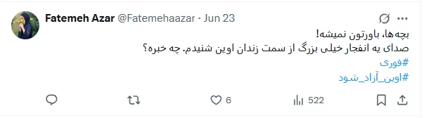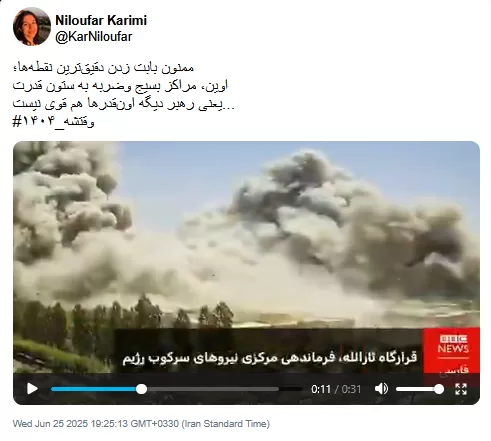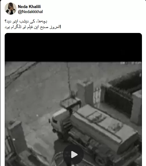- این حساب، یک ویدیوی تولید شده با هوش مصنوعی منتشر کرد که ظاهراً نشان دهنده سوختن زندان اوین بعد از حملات نیروهای دفاعی اسرائیل (IDF) بود. این پست تنها چهار دقیقه بعد از انتشار ویدیوی هوش مصنوعی توسط حساب KarNiloufar منتشر شد، در حالیکه بر اساس محاسبات عمومی که قبلا در این گزارش توضیح داده شد، حملات هنوز در حال انجام بودن.