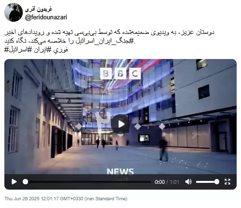 با توجه به موفقیت دیپ فیک زندان اوین در فریب رسانه های جریان اصلی، تگ کردن اکانتهای خبری در ویدیوهای دیگه که ظاهراً توسط شبکه تولید شده بودن، نشان دهنده تلاش مداوم برای فریب رسانه ها با محتوای غیرمعتبر جنگ 12 روزه در راستای روایتهای شبکه است. محققا دو نمونه از این تلاشها رو در زیر ارائه دادن.