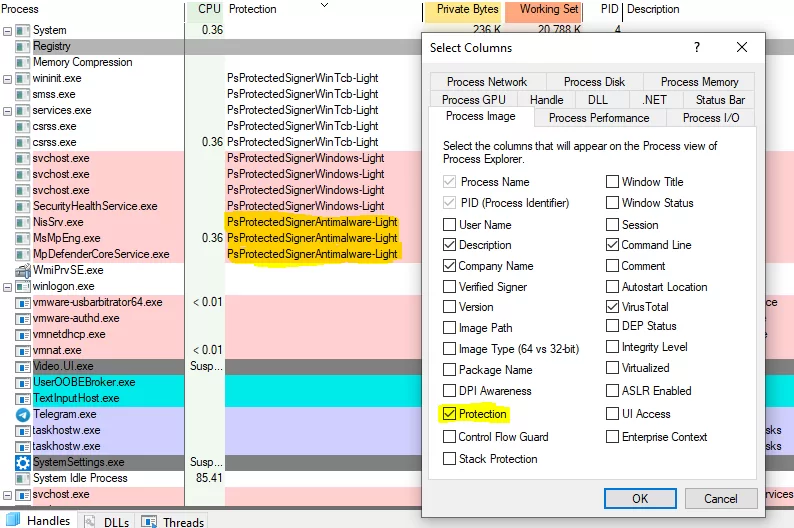 با این حال، اگه این کار رو روی پروسس هایی که با برچسب Antimalware مشخص شدن انجام بدیم، Process Explorer قادر به ساسپند کردن این پروسس ها نیست. برای مشاهده این ستون در Process Explorer، در قسمت عنوان ستونها راست کلیک کرده و گزینه ی Select Columns رو انتخاب کنید. در پنجره باز شده، در تب Process Image تیک گزینه ی Protection رو بزنید.