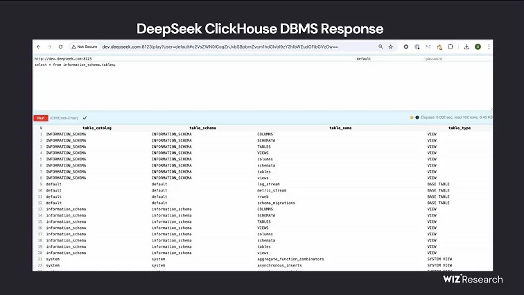 در عرض چند دقیقه، محققا یک دیتابیس ClickHouse در معرض دید عموم مرتبط با DeepSeek رو پیدا کردن که کاملاً باز و بدون احراز هویت بود و داده‌های حساس رو در معرض دید قرار میداد. این دیتابیس در oauth2callback.deepseek.com:9000 و dev.deepseek.com:9000 میزبانی میشد و حاوی حجم قابل توجهی از تاریخچه چت، داده های بک اند و اطلاعات حساس، از جمله لاگ استریمها، اطلاعات حساس API و جزئیات عملیاتی بود.