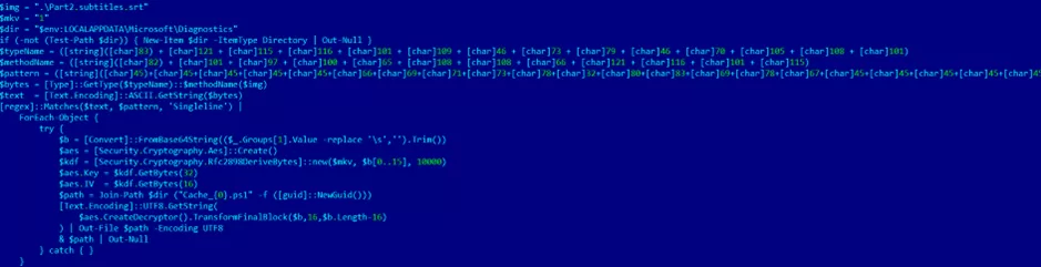 کد پاورشل، بلوکهای داده رمزگذاریشده رو از همان فایل زیرنویس (در خطوط 6034، 7216 و 7419) استخراج میکنه. این اسکریپت از رمزنگاری AES استفاده کرده و چندین اسکریپت پاورشل رو در فولدر زیر مینویسه: