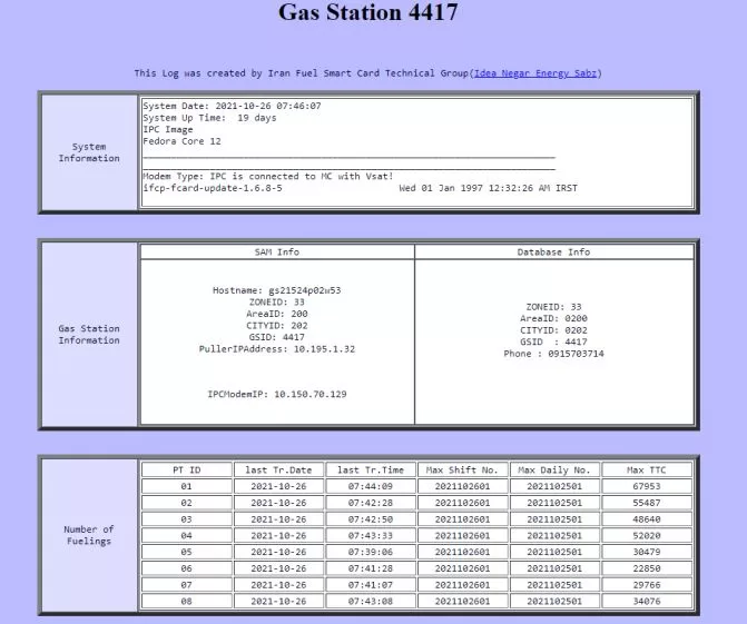 در 26 اکتبر 2021 / 4 آبان 1400 ، حدود ساعت 11 به وقت ایران ، تقریبا همه ی 4300 جایگاه سوخت در کشور، از کار افتادن. در عرض حدودا دو ساعت، هر دستگاه POS در هر جایگاه سوخت آفلاین میشه و از کار میافته. برخی دستگاههای POS ، که تعدادشون دقیقا مشخص نیست، همچنان روشن هستن اما قابلیت ارائه سرویس رو ندارن و به جای نمایش پیغام همیشیگی ، پیام “حمله سایبری 64411” روی صفحه ی نمایش POS نمایش داده میشه. عدد 64411 مرتبط با دفتر مقام معظم رهبری هستش و در حملات قبلی هم مورد استفاده قرار گرفته بود.