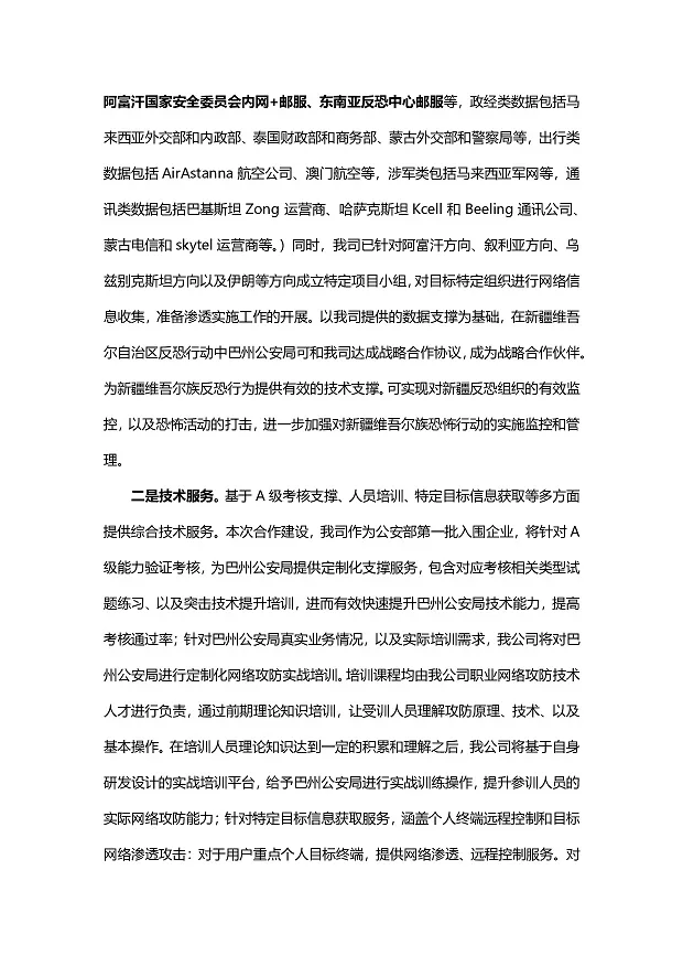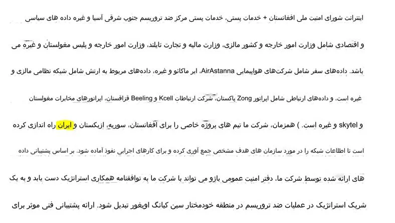 تنها سندی که اسم ایران (Iran,伊朗) توش بوده ، این سند هستش : (d410e4aa-fb52-4ed4-9078-4483267a02b3_1) (اشاره شده که یسری تیم رو راه اندازی کردن تا از شبکه یسری سازمان هدف اطلاعات جمع آوری کنن (ریکان احتمالا) و برای نفوذ آماده بشن. عنوان سند در خصوص توافقنامه ی همکاری امکان سنجی استان خودمختار بایاننوور هستش )