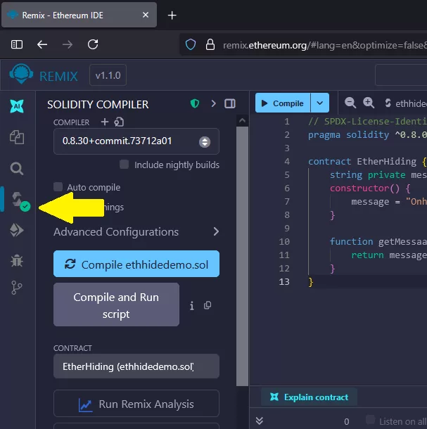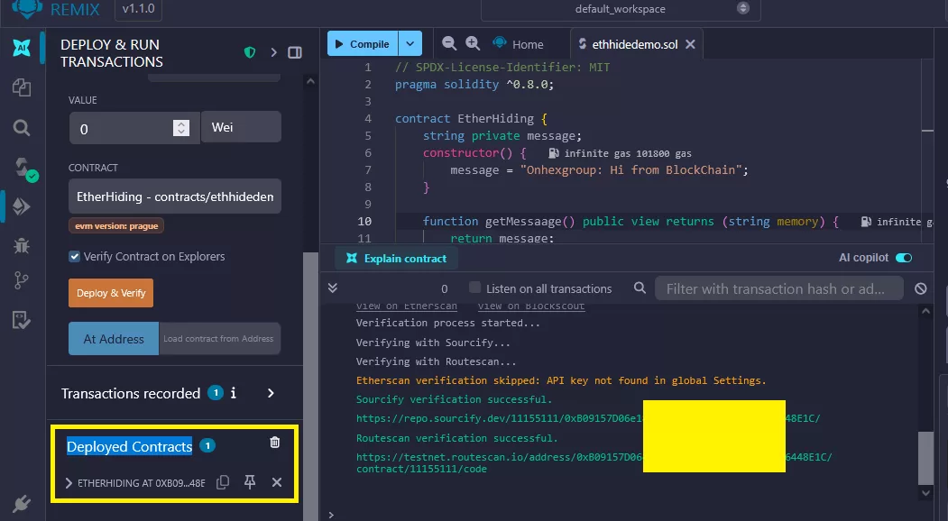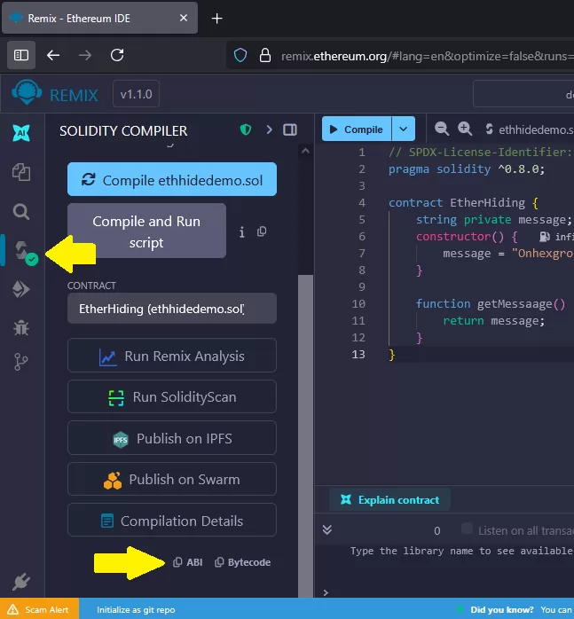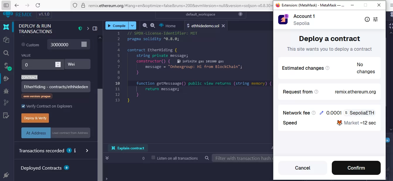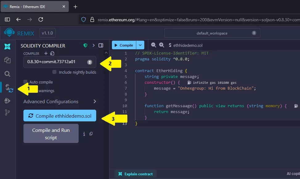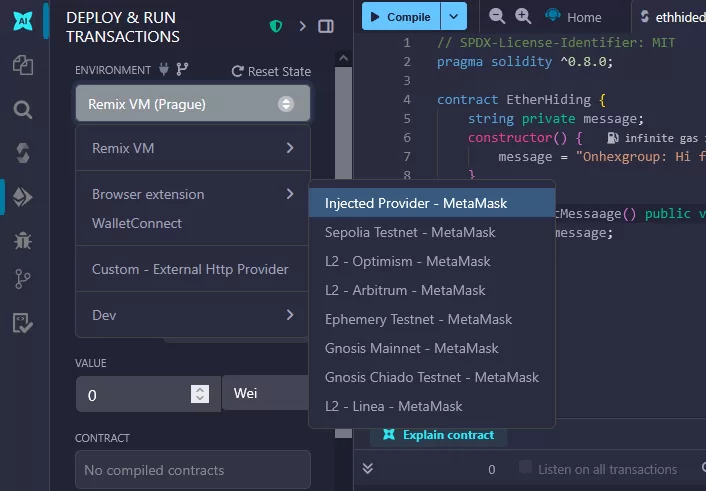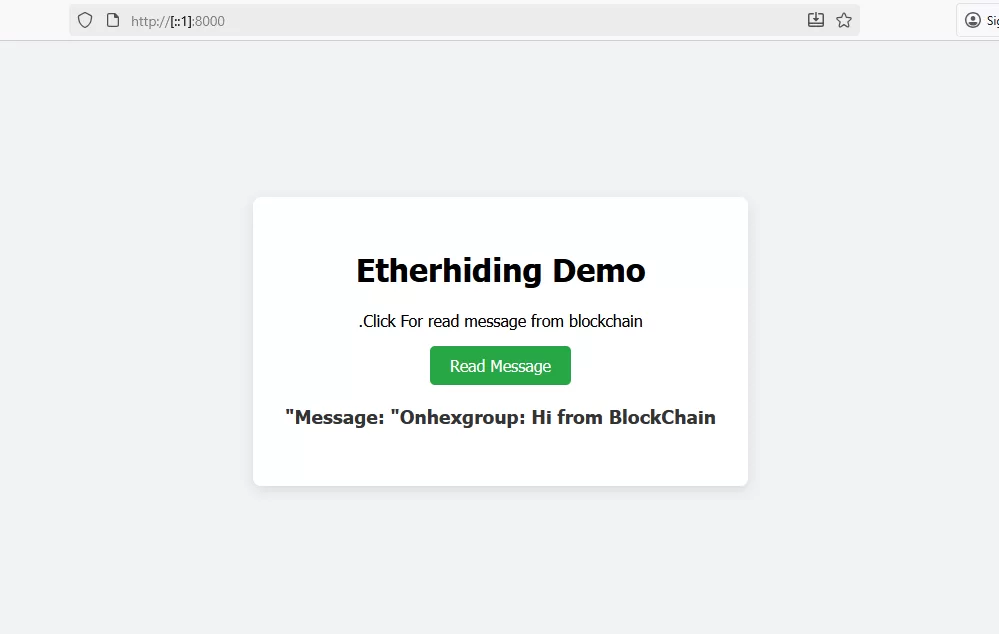 برای پیاده سازی تکنیک Etherhiding، کاری که میخواییم انجام بدیم این هستش که یک قرارداد هوشمند توسعه میدیم که رشته ی “Onhexgroup: Hi from BlockChain” رو برای ما بر میگردونه. برای اینکه بتونیم این متن رو نمایش بدیم، یک صفحه ی HTML توسعه میدیم که کاربر با کلیک روی یک دکمه، متن مورد نظر رو از بلاکچین بگیره و در صفحه مشاهده کنه.