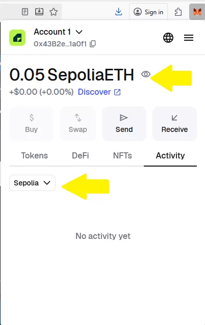 برای مشاهده ی مقدار دریافتی، در قسمت Activity، مقدار Ethereum mainnet رو به Sepolia تغییر بدید. برای این منظور روی Ethereum mainnet کلیک کنید، Custom رو انتخاب و در ادامه Sepolia رو فعال کنید.