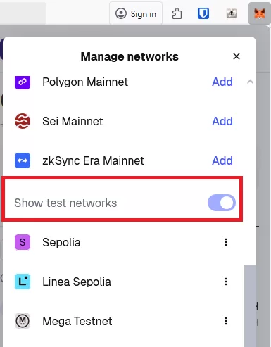 برای این منظور روی سه خط بالای متامسک کلیک میکنیم و Networks رو انتخاب کرده و گزینه ی Show test networks رو فعال میکنیم.