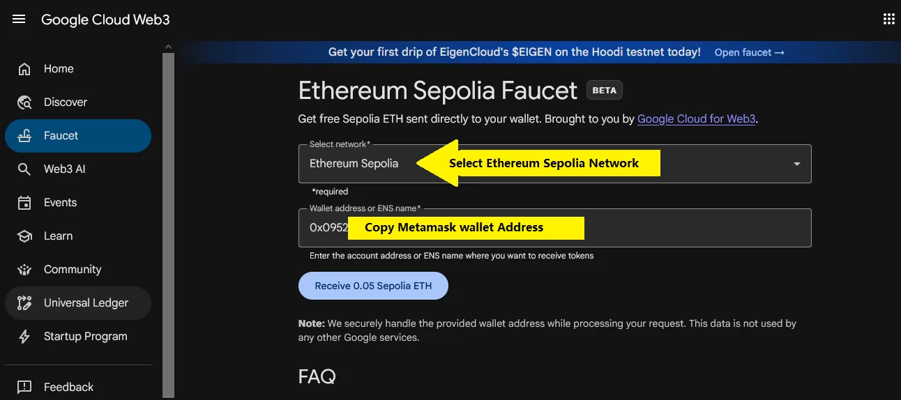 با جستجویی که در اینترنت انجام دادم، به این سرویس رسیدم که خیلی راحت تونستم 0.05 اتریوم به والت متامسک انتقال بدم. برای اینکه بتونید از این سرویس استفاده کنید، نوع شبکه رو روی Ethereum Sepolia، و آدرس والت اتریوم رو از متامسک در فیلد مربوطه کپی کنید.