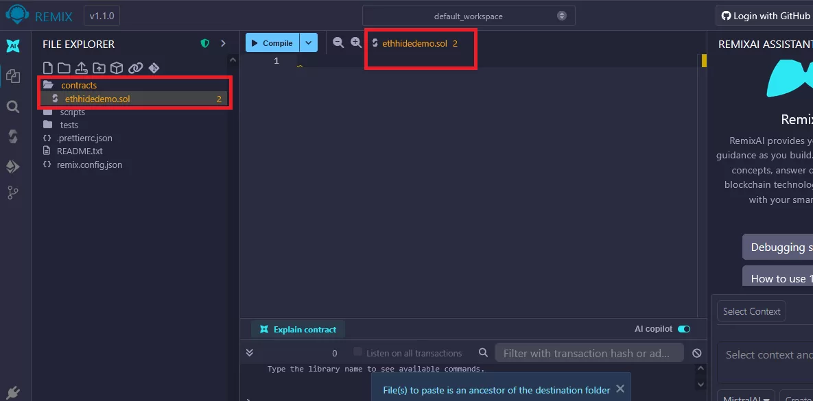 برای اینکه بتونید قرار هوشمندمون رو توسعه بدیم، وارد فولدر contracts میشیم و همه ی فایلهای موجود در این فولدر رو پاک میکنیم و یک فایل جدید با نام ethhidedemo.sol ایجاد میکنیم.