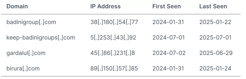 Domains: badinigroup[.]com birura[.]com gardalul[.]com keep-badinigroups[.]com IP Addresses: 5[.]253[.]43[.]92 38[.]180[.]54[.]77 45[.]86[.]231[.]8 89[.]150[.]57[.]85 |