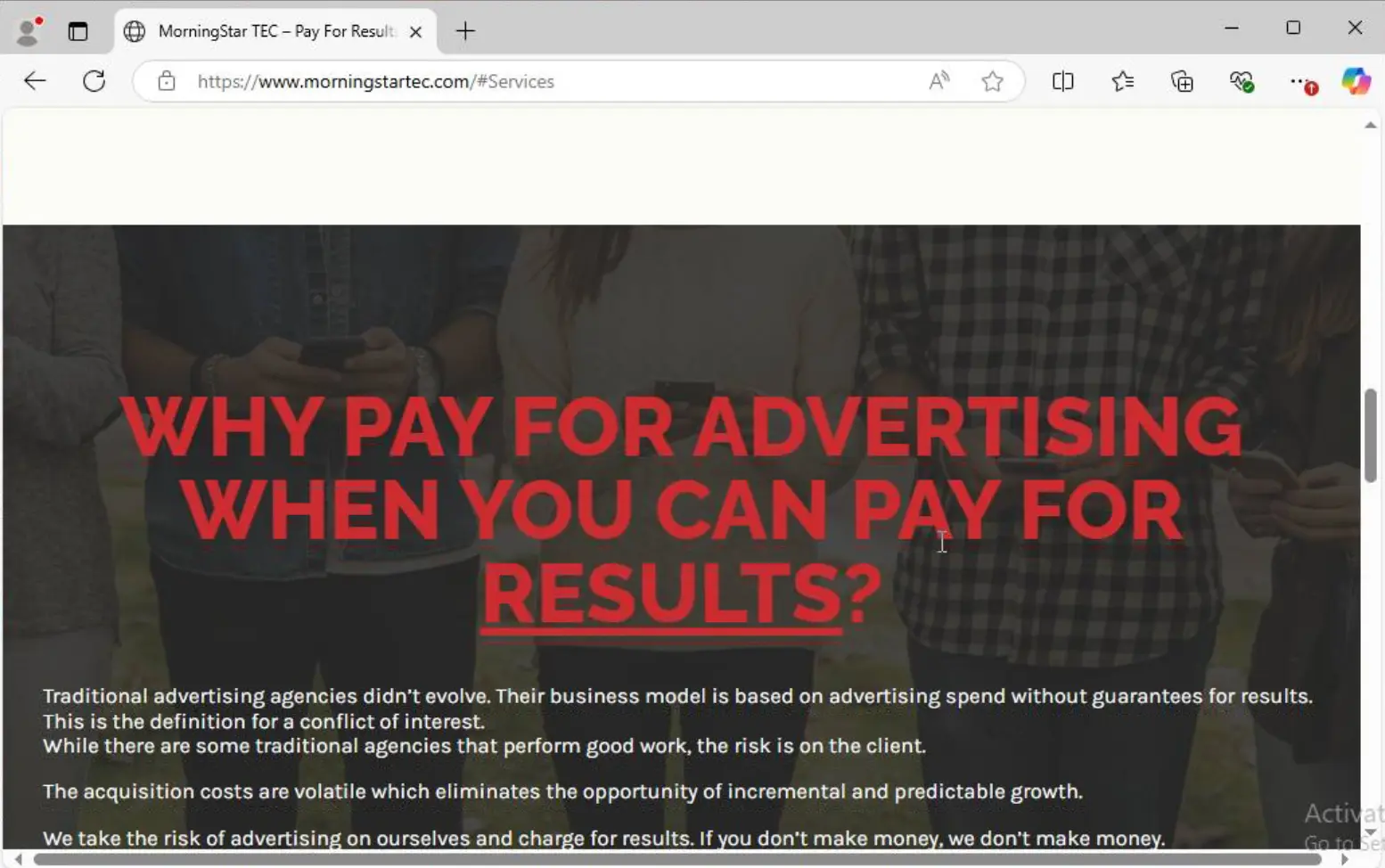 در مقابل، گفته میشه مدل کسب و کار MorningStar TEC بجای تبلیغات سنتی، روی نتایج مبتنی بر عملکرد تمرکز داره (شکل زیر). نکته قابل توجه این که برخی بخشهای سایت MorningStar TEC بطور نادرست برنامه نویسی شدن، مثلا، کلیک روی برگهی Benefits باعث دانلود فایل HTML سایت میشه.