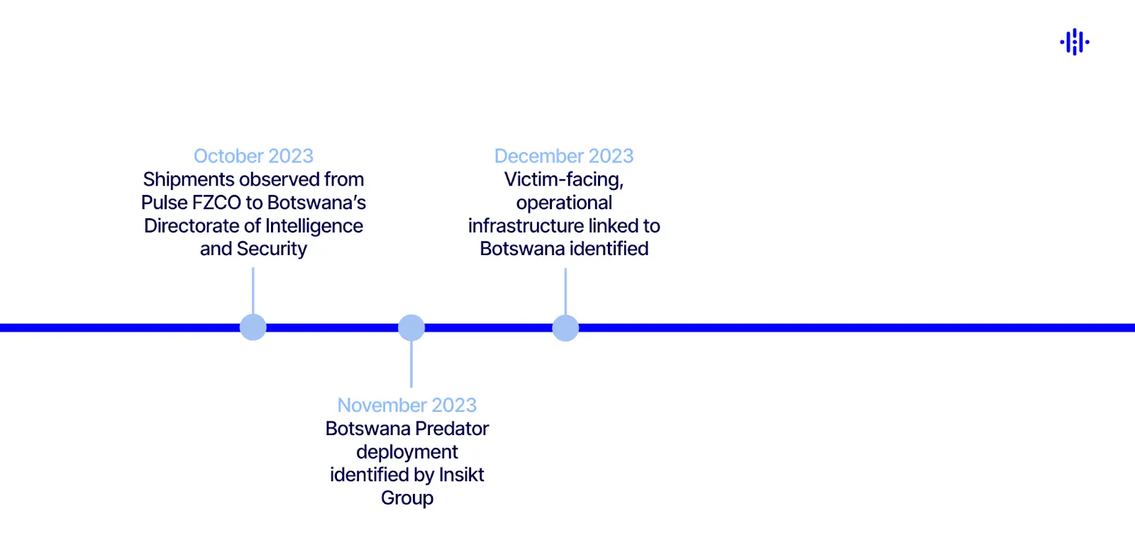 براساس سوابق واردات، Insikt Group شناسایی کرده که PULSE FZCO در اکتبر ۲۰۲۳ محمولههایی رو برای اداره اطلاعات و امنیت بوتسوانا (DIS) (یک کشور در آفریقا) ارسال کرده. این سازمان قبلا هم با واردات سایر محصولات نظارتی مرتبط بوده. شرح محمولهها با اصطلاحات فنی نسبتا کلی ارائه شده. با اینکه ارزش گزارش شدهی محموله پایین به نظر میرسه، این موضوع ممکن به دلیل کامل نبودن دیتابیسهای واردات، استفاده از شرکتهای پوششی اضافی، یا ماهیت کالاها باشه، مثلا بخشی از سامانه بجای پلتفرم کامل هستش.