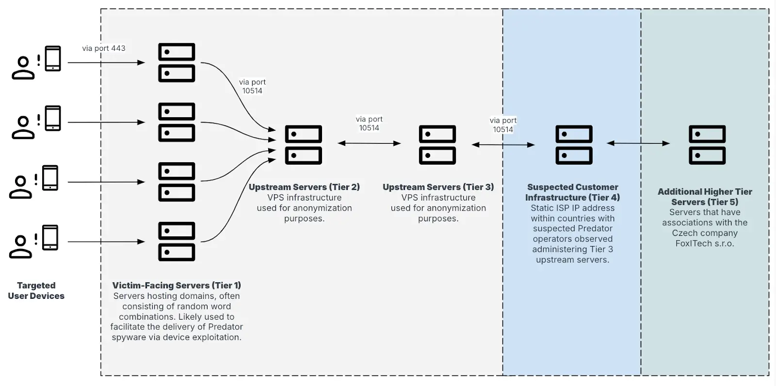 علاوه بر این، چندین سرور Tier 4 در خوشه های دیگه، متعلق به مشتریان Predator، همچنان با زیرساخت Tier 5 ارتباط برقرار میکردن (شکل زیر).