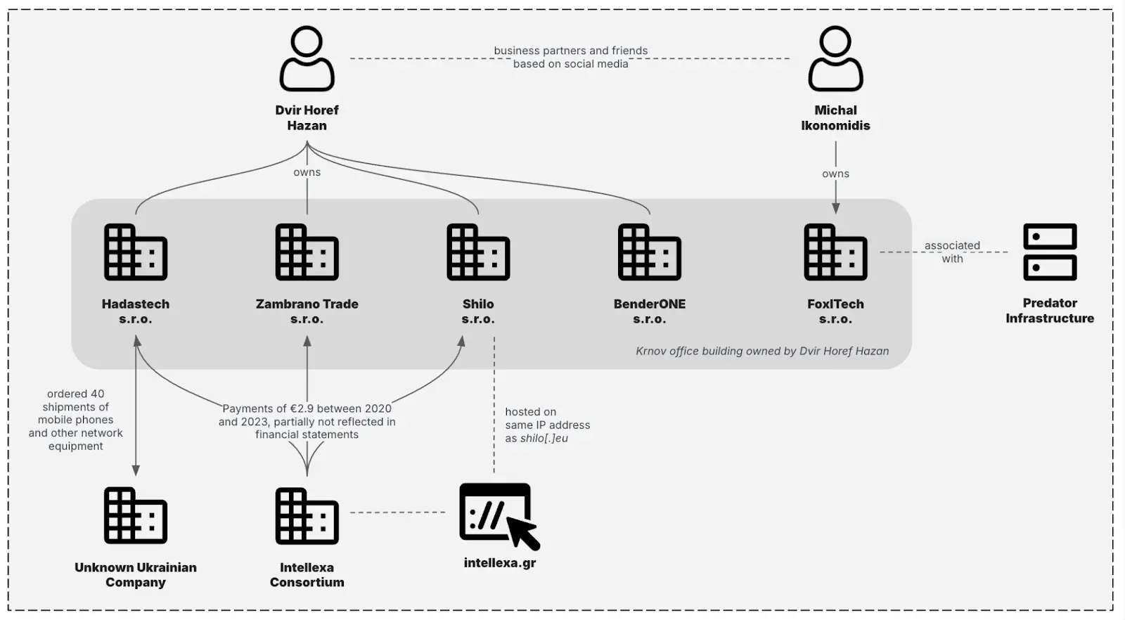 Insikt Group از طریق تحقیقات سازمانی تونست مجموعه جدیدی از شرکتها، که با احتمال بسیار زیاد با Intellexa مرتبط هستن رو، شناسایی کنه. این شرکتها از طریق خوشه ی چک که قبلا گزارش و با Dvir Horef Hazan مرتبط بود، ردیابی شدن.