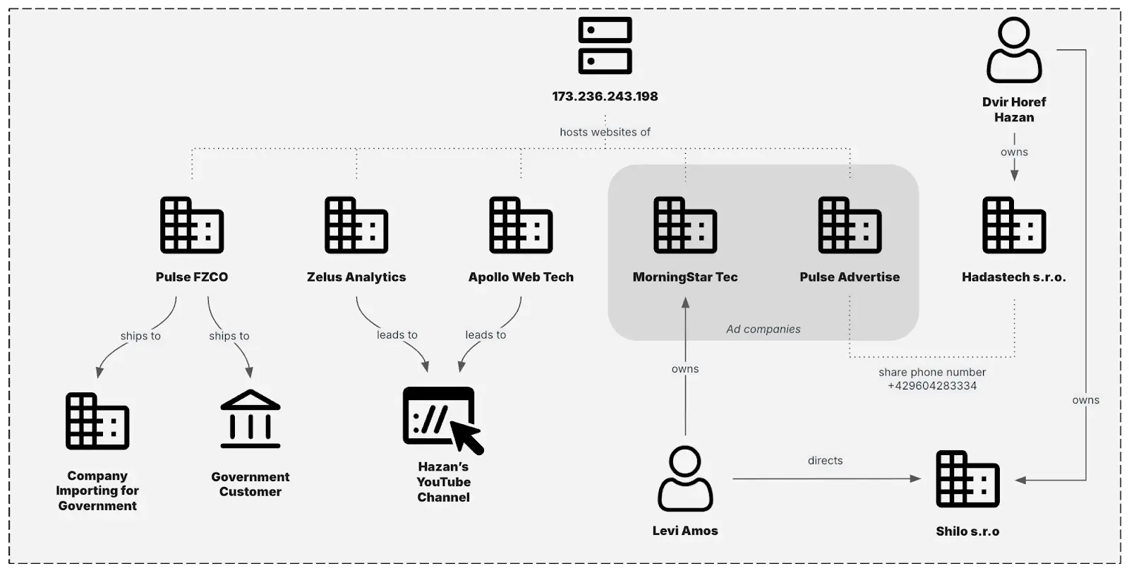 مشابه PULSE FZCO، این شرکت هم در مناطق آزاد DIFZA امارات ثبت شده. Insikt Group ارزیابی میکنه که Pulse Advertise احتمالا در بردار حملهای موسوم به Aladdin نقش داره. نکتهی مهم اینکه شماره تماس درج شده برای Pulse Advertise دقیقا همان شمارهای است که برای شرکت Hadastech s.r.o ثبت شده. شرکتی که طبق گزارش پلیس یونان، از Intellexa مبالغی برای خدمات نامشخص دریافت کرده و بین سالهای ۲۰۲۰ تا ۲۰۲۱ تعداد ۴۰ محموله از یک شرکت اوکراینی ناشناس وارد کرده، که بعنوان “تلفن همراه” و “سایر تجهیزات شبکهای” توصیف شده بودن.