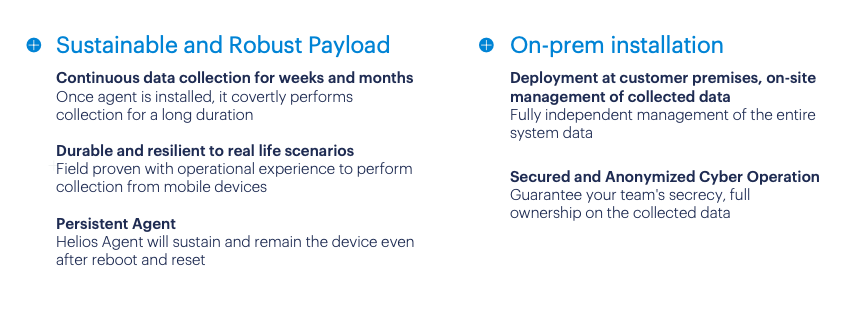 بر خلاف جاسوسافزارهایی که توسط رقبا ساخته میشه، Predator تقریبا بطور انحصاری بر حملات موسوم به One-click برای آلوده کردن دستگاهها تکیه داره. حملاتی که نیاز دارن قربانی یک لینک مخرب رو در گوشی خودش باز کنه. لینک مخرب، یک اکسپلویت مرورگر برای کروم (در اندروید) یا Safari (در iOS) رو لوود میکنه تا دسترسی اولیه به دستگاه رو بدست بیاره و پیلود کامل جاسوسافزار رو دانلود کنه. برشورهای بازاریابی شرکت (شکل بالا) نشان میده که پس از نصب جاسوسافزار، دادههای بسیار گستردهای قابل دسترسی است، از جمله: