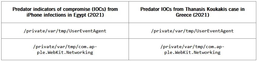 عفو بینالملل حملات دیگه ای از Predator رو با آثار آلودگی مشابه مشاهده کرده، از جمله روی دستگاه روزنامهنگار یونانی، Thanasis Koukakis، که تلفناش در سالهای ۲۰۲۰ و ۲۰۲۱ با Predator هدف قرار گرفت. تلفن Koukakis شواهدی از نام پروسسهای “UserEventAgent” و “com.apple.WebKit.Networking” رو نشان میداد که از همان دایرکتوری private/var/tmp/اجرا میشدن، که توسط Citizen Lab در پرونده مصر هم مشاهده شده. پروسسهای قانونی اپل از این دایرکتوری اجرا نمیشن.