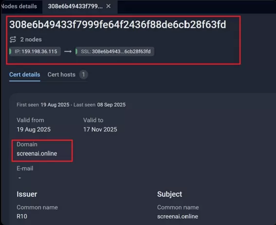 | C2 Domain | Creation date 2025-08-17 | screenai[.]online |