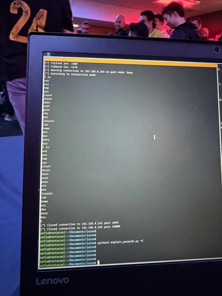 Synacktiv team با موفقیت تونستن دوربین Lorex رو با دو باگ اکسپلویت کنن اما یکی از باگهایی که استفاده کردن قبلا شناخته شده بود، BUG COLLISION شد. 11,250 دلار جایزه نقدی و 2.25 امتیاز Master of Pwn بدست آوردن.