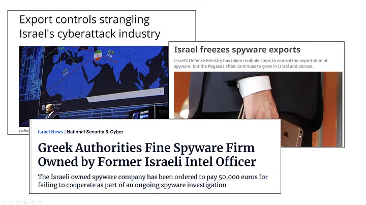 - https://www.timesofisrael.com/defense-ministry-said-to-freeze-export-licenses-for-israeli-cyberattack-tech