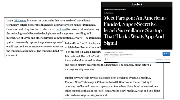 - https://www.forbes.com/sites/thomasbrewster/2021/07/29/paragon-is-an-nso-competitor-and-an-american-funded-israeli-surveillance-startup-that-hacks-encrypted-apps-like-whatsapp-and-signal/?sh=222a3c8f153b