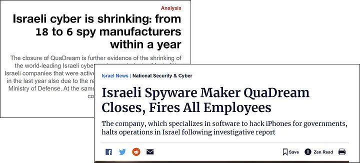 - https://www.haaretz.com/israel-news/security-aviation/2023-04-16/ty-article/.premium/offensive-israeli-cyber-firm-quadream-closes-and-fires-all-employees/00000187-8b5c-d484-adef-ebdc048c0000
