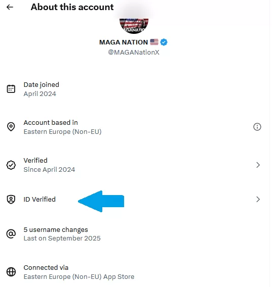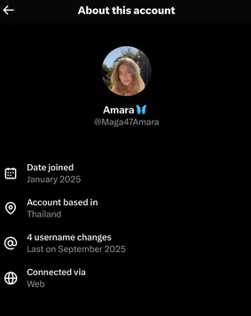 برای مثال با بررسی About this account، برخی از اکانتهای طرفدار غزه، آمریکا، اسکاتلند و … ، مشخص شده که این اکانتها خارج از اون مناطق مدیریت میشدن. مثلا اکانت زیر، که خودش رو یک زن مستقل حامی ترامپ و ساکن آمریکا معرفی میکرد، مشخص شده از تایلند مدیریت میشده. بنابراین با بررسی این ویژگی جدید، میشه به این نوع اکانتها مشکوک شد.