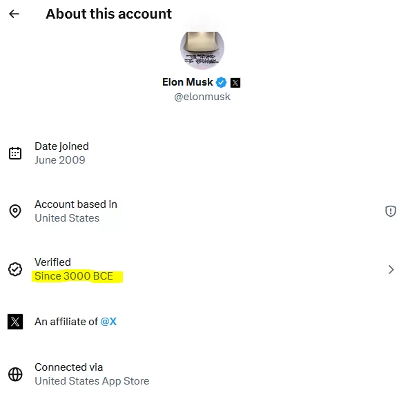در X برخی اکانتها خاص هستن. مثلا اکانت مربوط به ایلان ماسک، برای تاریخ تایید، عبارت تایید از 3000 سال قبل از میلاد رو درج کرده.