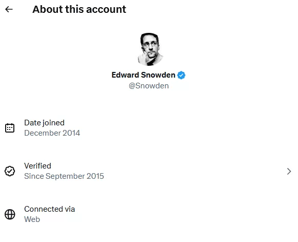 یا برای اکانت ادوارد اسنودن، بصورت زیر: (قسمت Account base in وجود نداره. اینکه این قسمت در اکانتهایی که تیک آبی دارن قابل حذف یا نه، چیزی منتشر نشده).