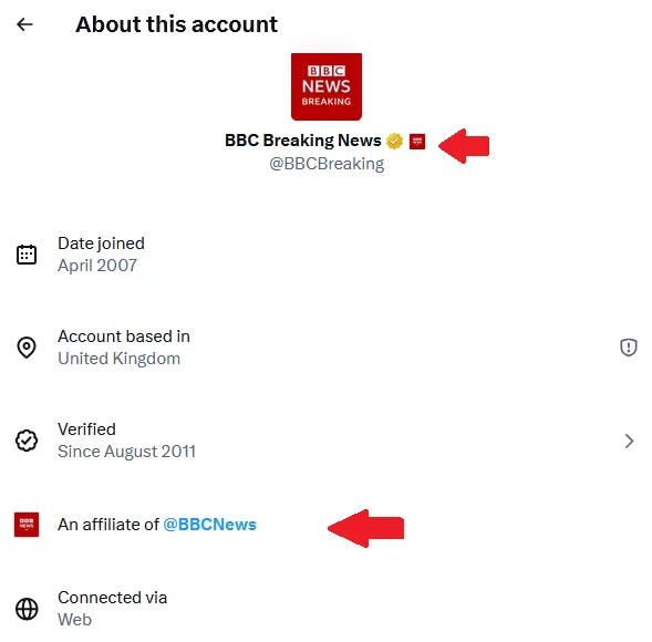 در X اگه اکانتی مرتبط یا زیرمجموعه یک سازمان تایید شده باشه، جلوی اسمش، تصویر پروفایل اون سازمان درج میشه. قابلیت About this account برای این نوع اکانتها، سازمان تایید شده رو هم نشان میده. در زیر دو نمونه رو مشاهده میکنید.